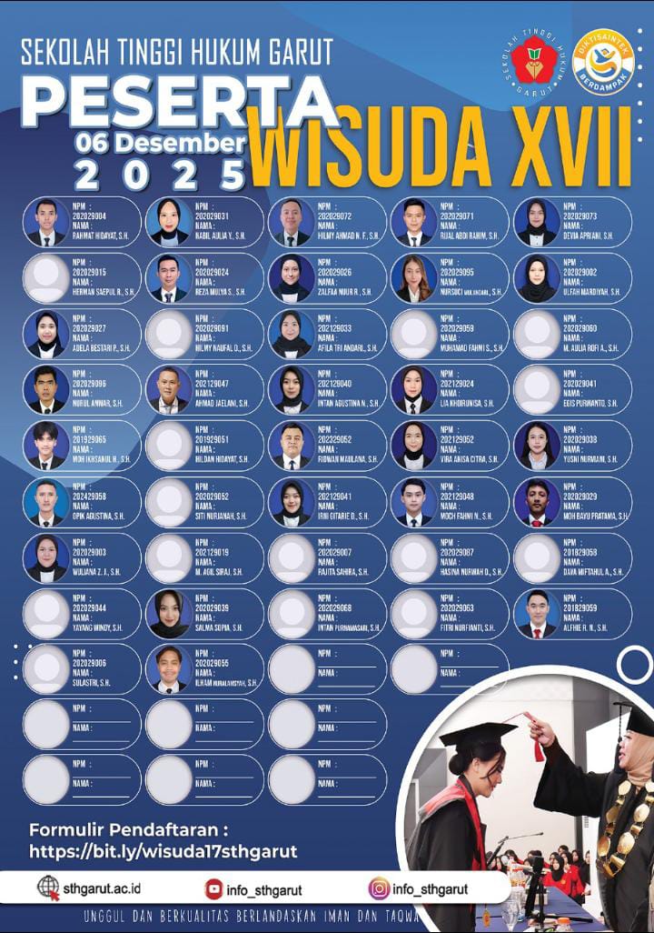 Sekolah Tinggi Hukum Garut akan menggelar Wisuda XVII pada 6 Desember 2025, melepas puluhan lulusan terbaik untuk menyandang gelar Sarjana Hukum (S.H.) dengan semangat profesionalisme dan pengabdian kepada masyarakat.